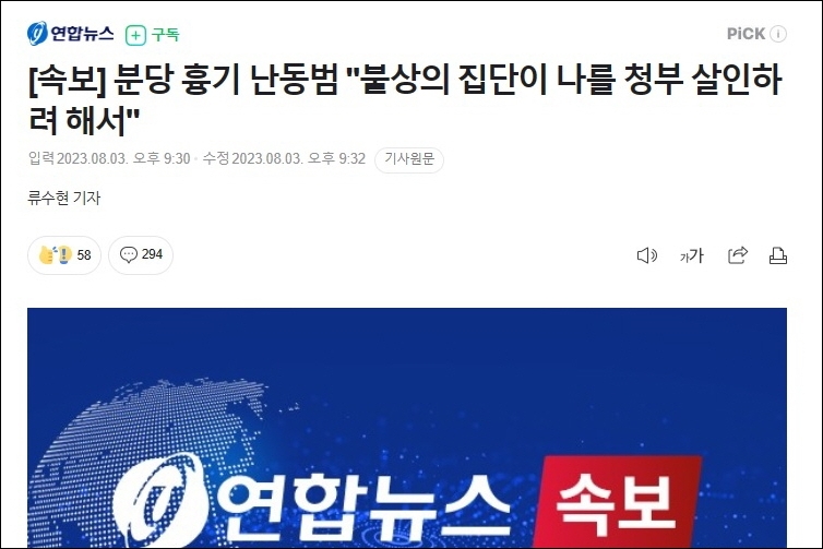 아마도 며칠 내 신림동 사건의 범인 '조선'처럼 이번 분당 서현역 칼부림 사건의 범인 역시 그 신상이 공개되지 않을까 싶다. 비교를 하는 게 참 웃긴 일이지만 이놈은 조선보다 더 한 놈이다. 퇴근 시간 붐비는 역사 앞 인도로 차량을 몰고 돌진해 보행자를 들이받은 그는 사고 충격으로 차가 움직이지 않아 차에서 내려 건물로 들어갔다. 그리고 가지고 있던 흉기를 이용해 지나가는 사람들을 향해 무차별적인 흉기 난동을 벌였다.